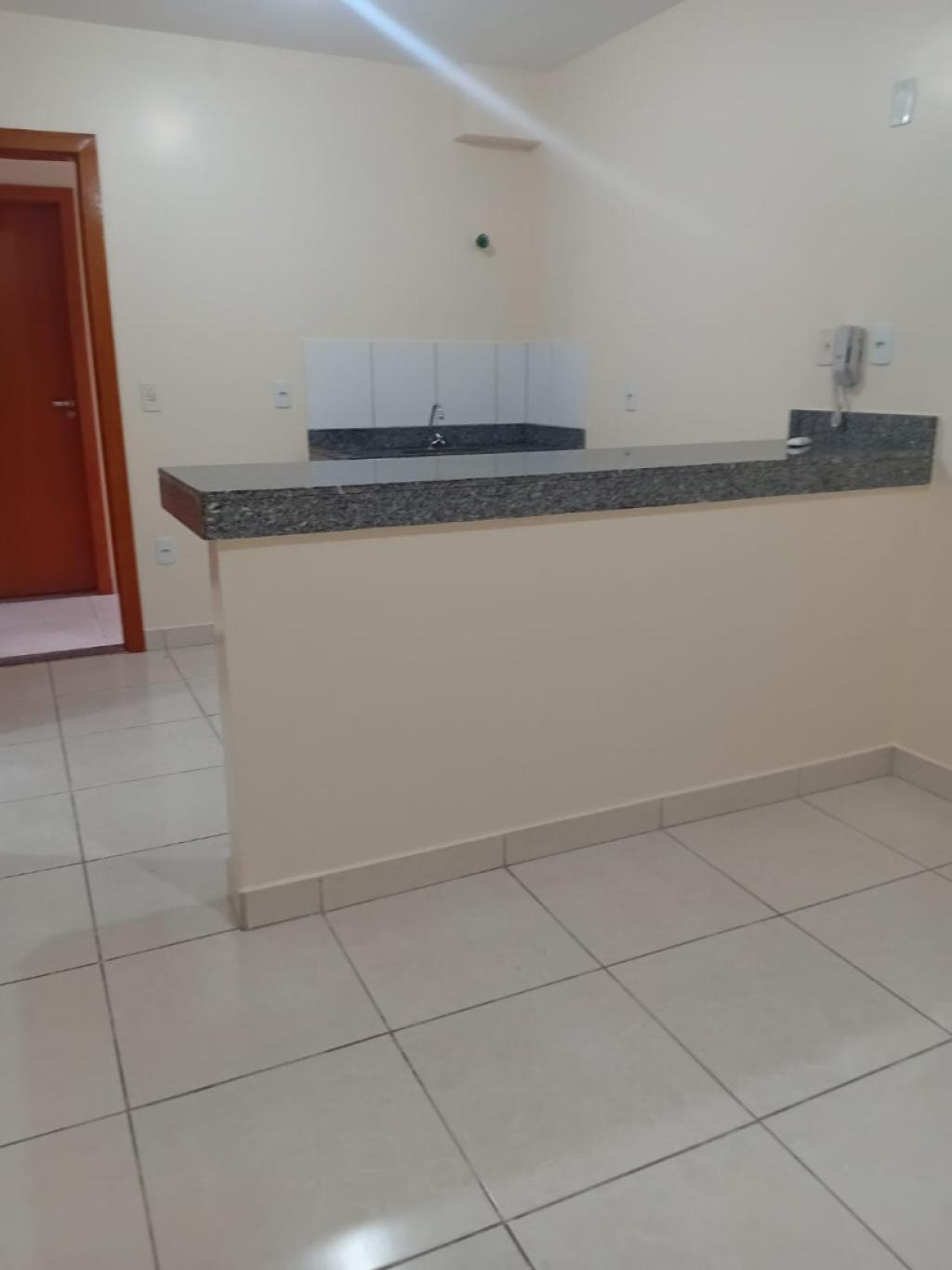Kitnet com quarto conjugado e cozinha americana, equipada com bancada em granito.